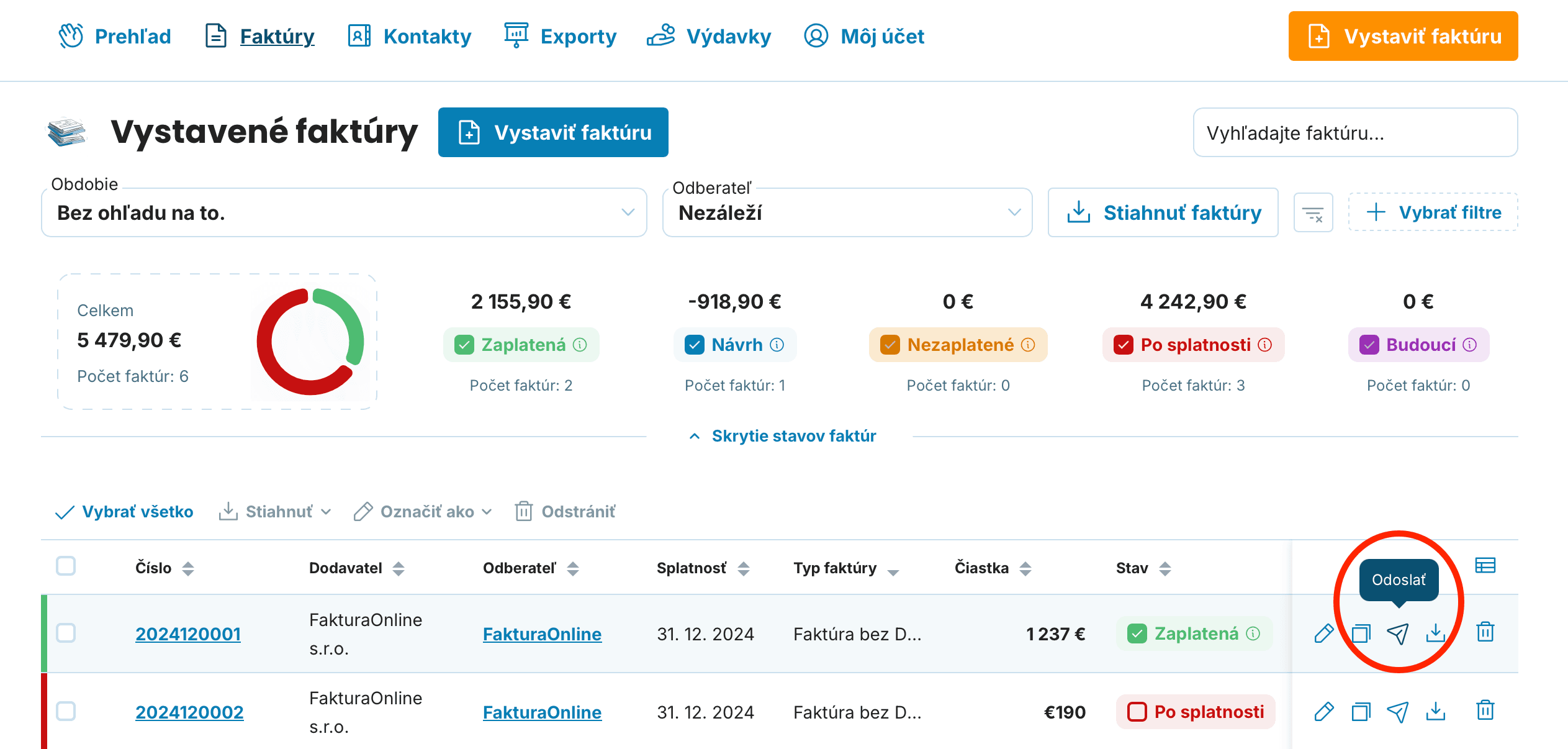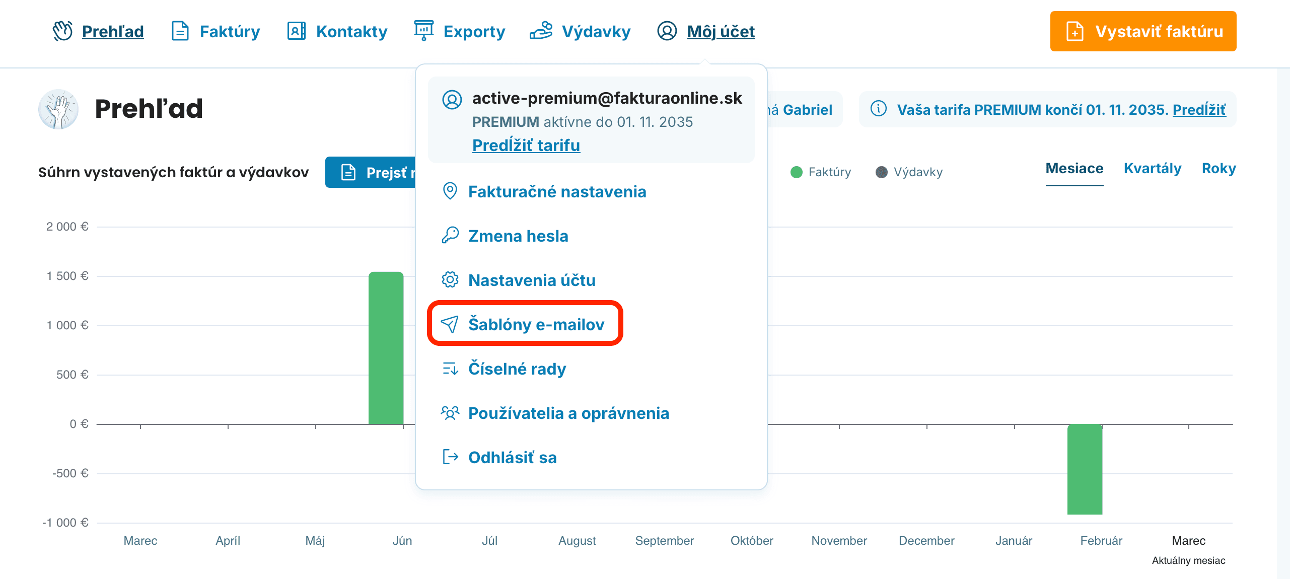 Používatelia tarifu Premium majú možnosť kedykoľvek odoslať už vystavenú faktúru e-mailom v sekcii Vystavené faktúry.