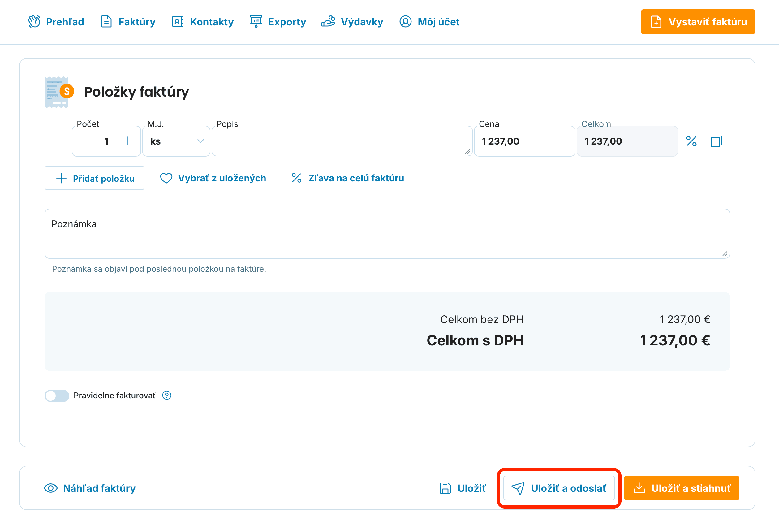 Ak nechcete faktúru odoslať e-mailom priamo v rozhraní aplikácie, môžete ju cez tlačidlo Vystaviť a stiahnuť stiahnuť do svojho počítača a ďalej s ňou pracovať podľa potreby.