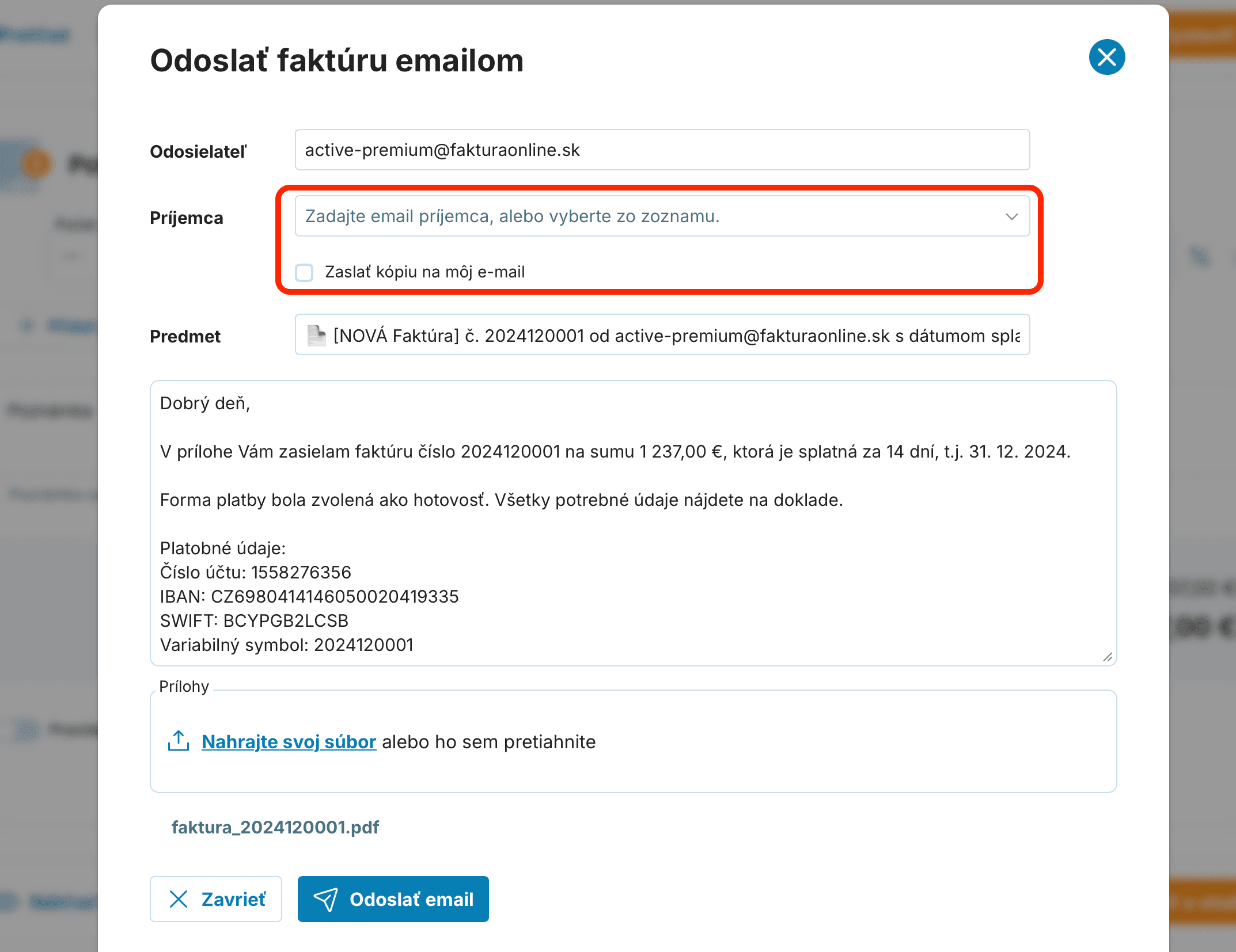 Voliteľne upravte text e-mailu, pridajte zaslanie kópie na váš e-mail alebo prílohu