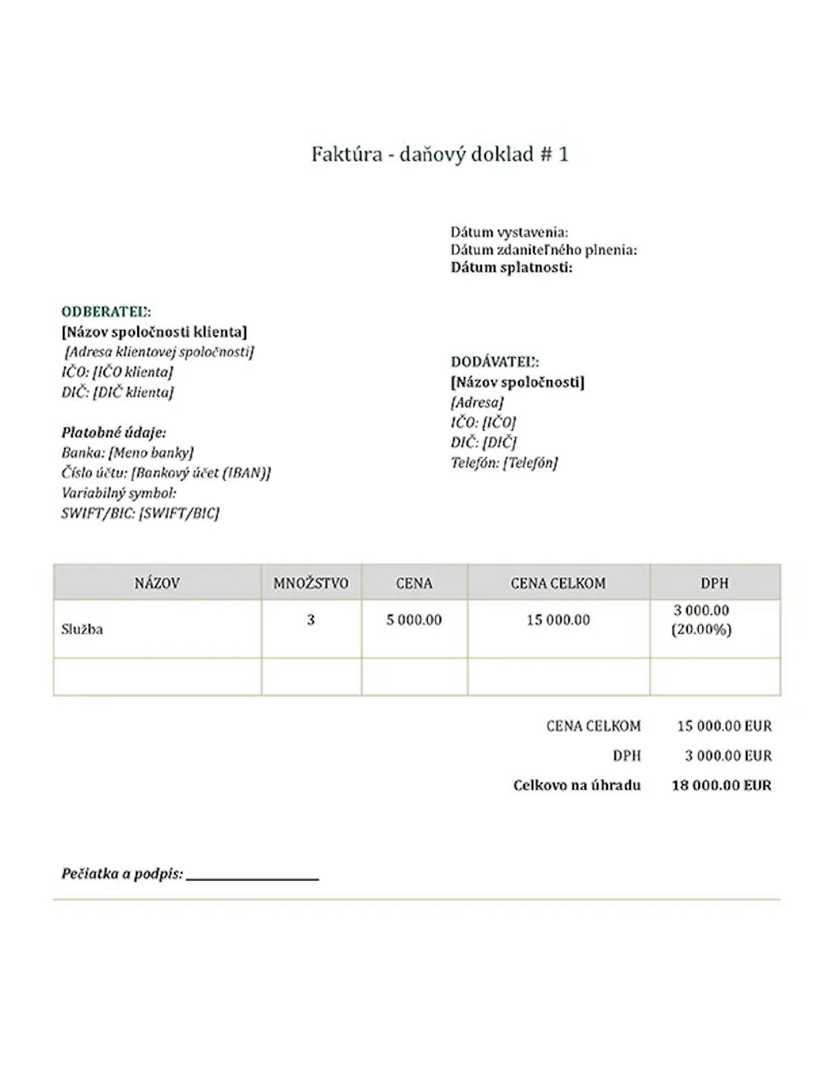 Označenie a číslo dokladu – jednoznačné označenie (napr. „Faktúra č. 20250015") s unikátnym číslom vo vašej číselnej rade.