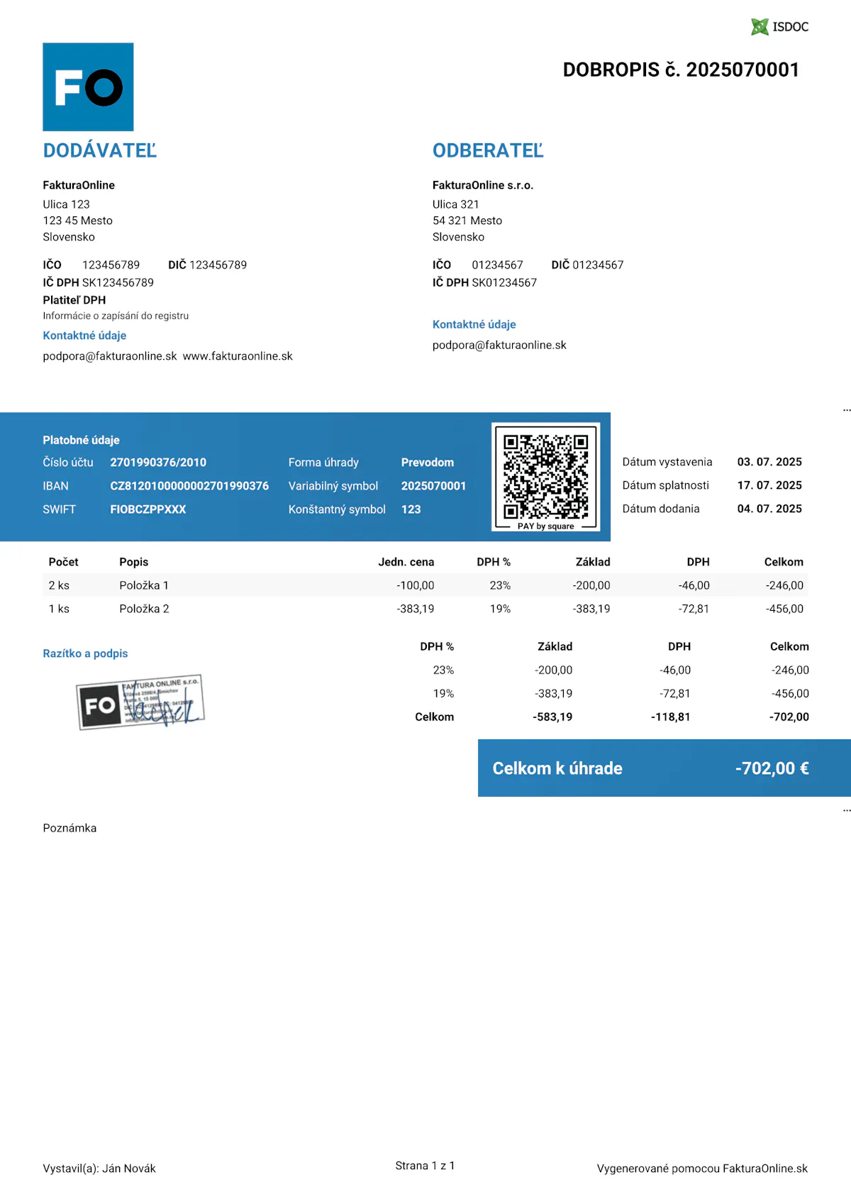 Vzor opravnej faktúry (dobropisu)